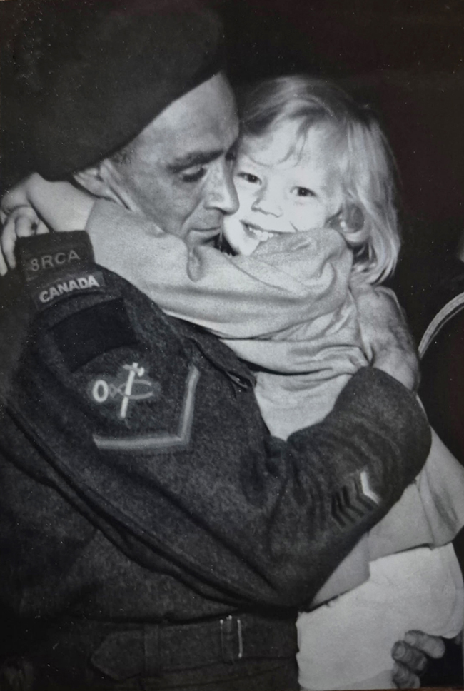 This is Pat Stretch of Edmonton, Alberta greeting her Dad, William John McLennan (Bill), in June 1945. Bill was one of the first group of men to be returned. He served in England, Italy, North Africa, and Holland in the Royal Canadian Artillery, 8th Regiment. Her mother was the former Joan Rennison. Pat said: “My Mom had done an amazing job of preparing me to love my Daddy. I was so excited to have him home, whereas several of my friends were afraid of their Dads at first!”