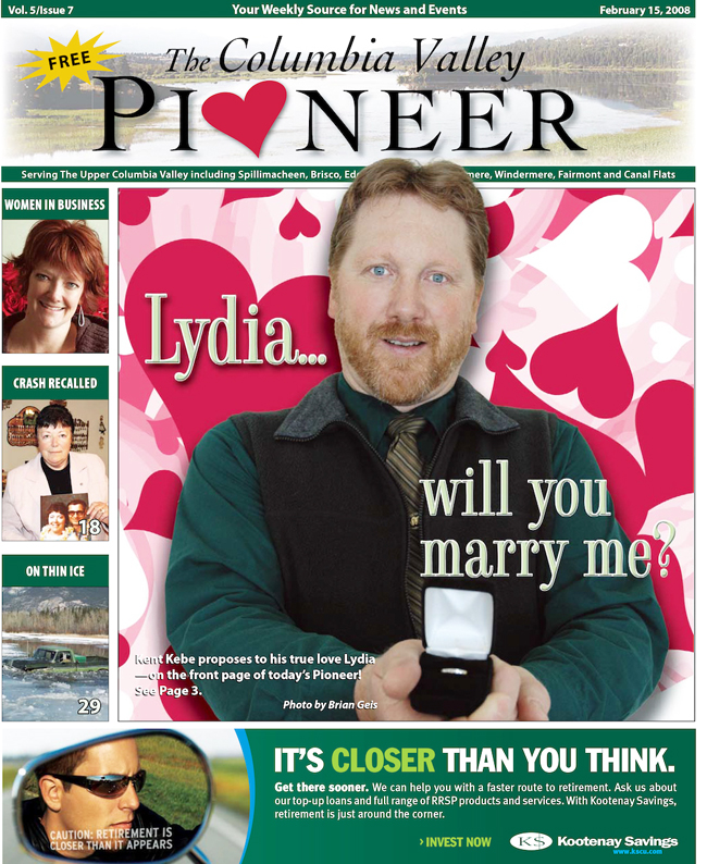 I owned the Columbia Valley Pioneer weekly newspaper for several years until I sold it in 2010 and decided to try writing fiction. Little did I know it would turn into a second career! The paper is still a community staple — this man even proposed to his girlfriend on our front page.