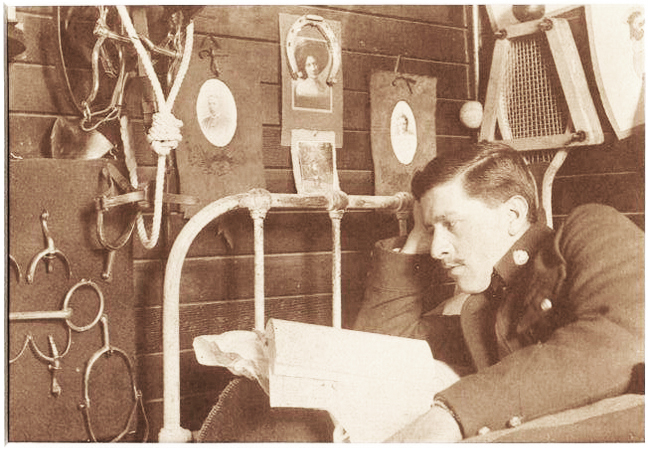 My great-uncle Ernest Bavin of the North-West Mounted Police was photographed about 1910, lying on his bunk at Fort Battleford, Saskatchewan. Hanging above his bed is a picture of my great-aunt Constance Light (known as Birdie), framed with a lucky horseshoe. They were engaged at the time, against her father’s wishes. My great-grandfather didn’t want his daughter to marry a Mountie, because he was a Staff-Sergeant at Fort Battleford himself!